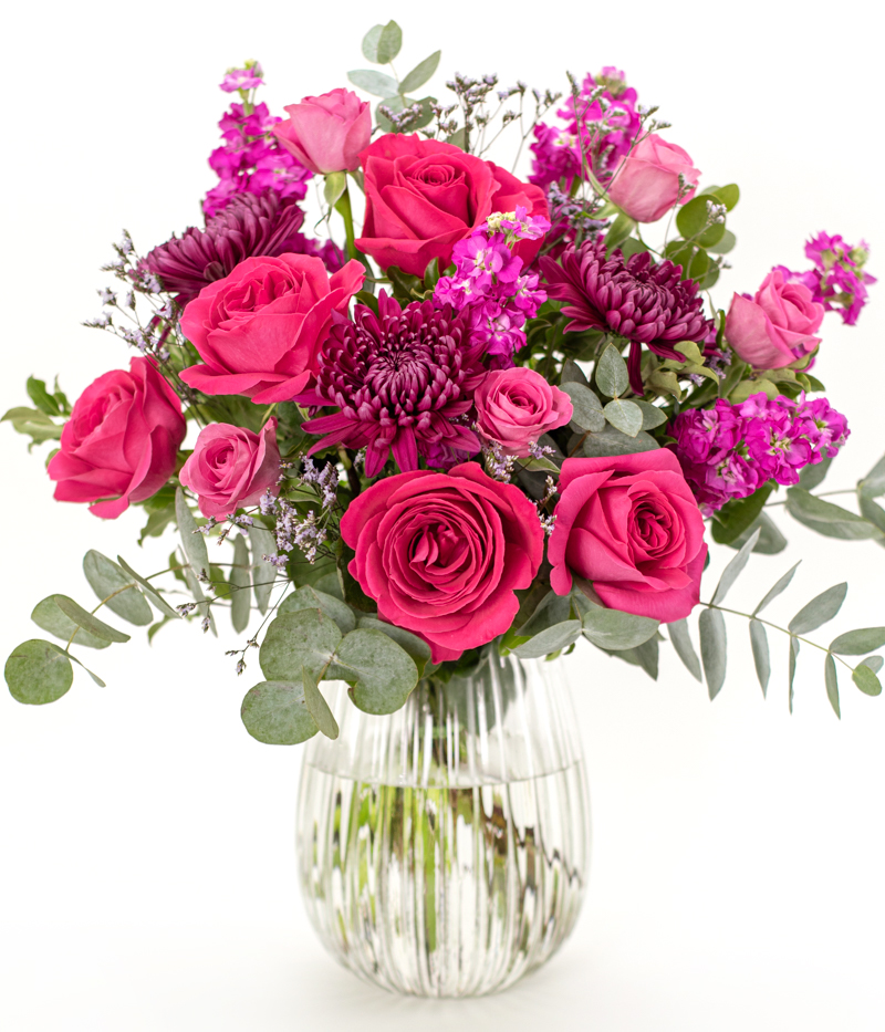 A gorgeous bouquet of cerise and soft pink roses, purple chrysanthemums, stocks, and eucalyptus. The vibrant pinks and purples blend beautifully with the fresh greenery. Delivered in bud to extend their beauty, these flowers will slowly reveal their charm at home. Sent in a special Eflorist box, they arrive safe and sound while offering a delightful unboxing moment. With tracked delivery, you’ll always know when your surprise reaches its destination. Unforgettable beauty at a price you will love.